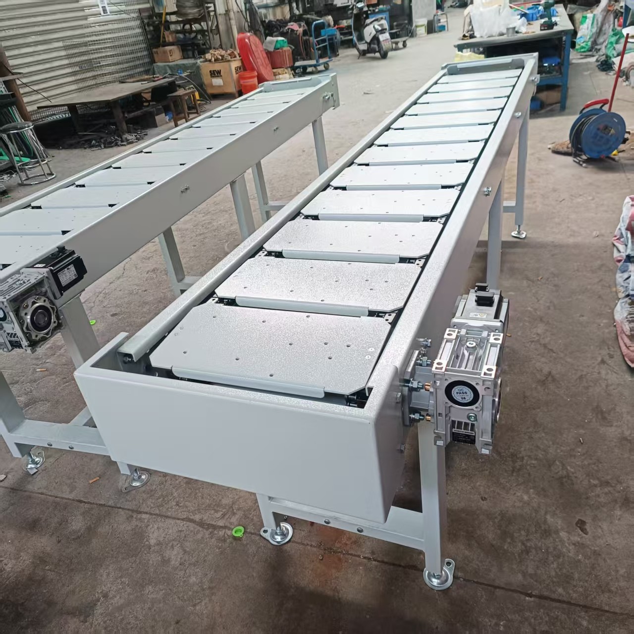 鏈板輸送機(jī)是一種以標(biāo)準(zhǔn)鏈板為承載面,由馬達(dá)減速機(jī)為動(dòng)力傳動(dòng)的傳送裝置。鏈板式輸送機(jī),由動(dòng)力裝置(電機(jī))、傳動(dòng)軸、滾筒、張緊裝置、鏈輪、鏈條、軸承、潤(rùn)滑劑、鏈板等等構(gòu)成。